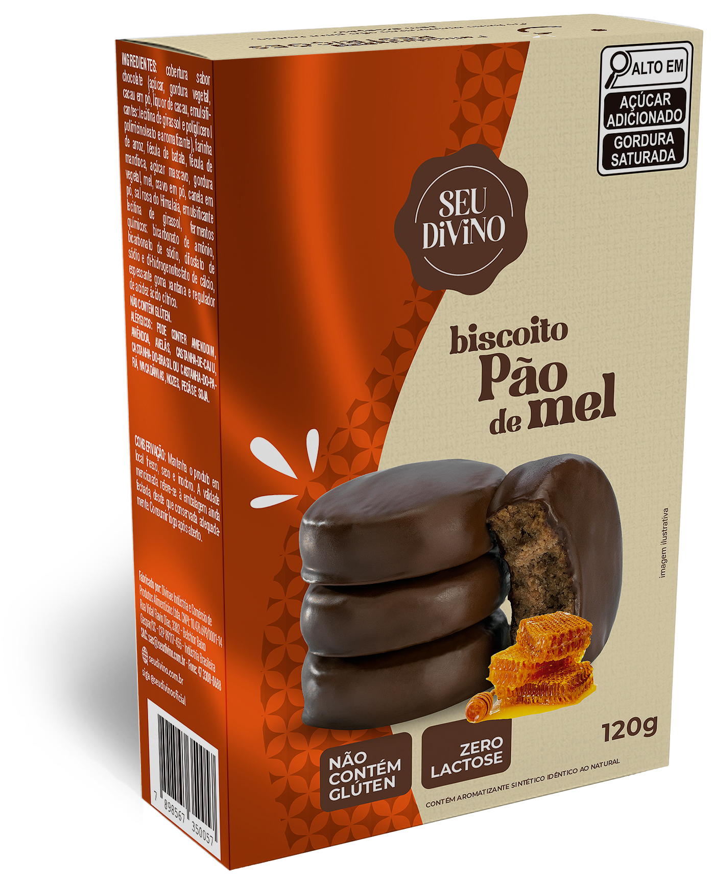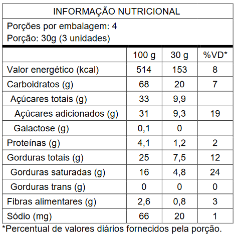 Ingredientes: cobertura sabor chocolate (açúcar, gordura vegetal, cacau em pó, liquor de cacau, emulsificantes: lecitina de girassol e poliglicerol polirricinoleato, e aromatizante), farinha de arroz, amido, açúcar mascavo, gordura vegetal, mel, cravo em pó, canela em pó, sal rosa do Himalaia, emulsificante lecitina de girassol, fermentos químicos: bicarbonato de amônio, bicarbonato de sódio, difosfato de sódio e di-hidrogenofosfato de cálcio, espessante goma xantana e regulador de acidez ácido cítrico.