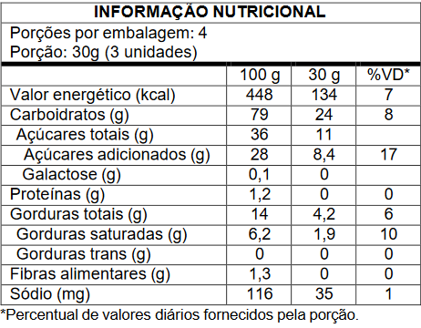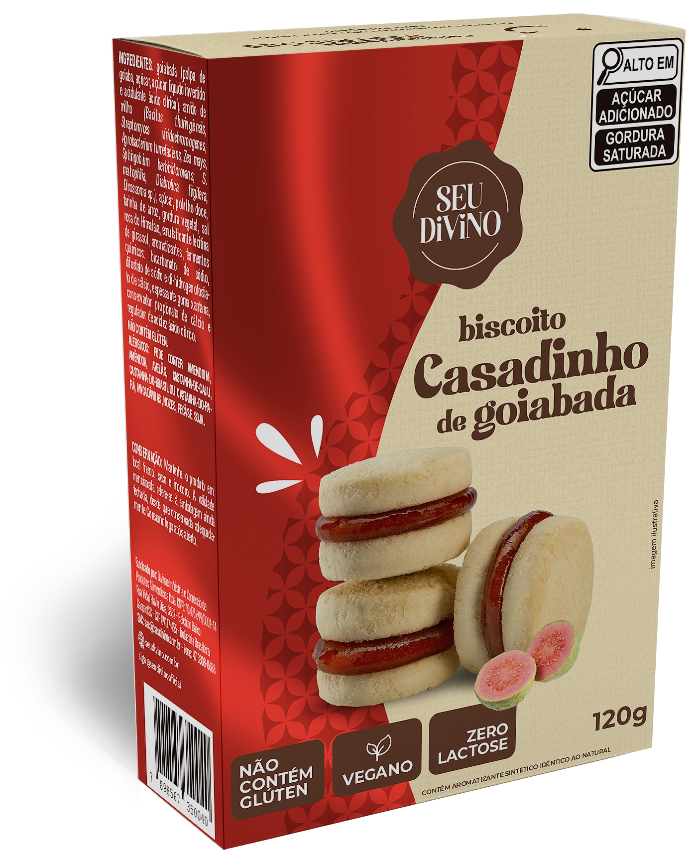 Ingredientes: goiabada (polpa de goiaba, açúcar, açúcar líquido invertido e acidulante ácido cítrico, açúcar, polvilho doce, farinha de arroz, gordura vegetal, sal rosa do Himalaia, emulsificante lecitina de girassol, aromatizantes, fermentos químicos: bicarbonato de sódio, difosfato de sódio e di-hidrogenofosfato de cálcio, espessante goma xantana, conservador propionato de cálcio e regulador de acidez ácido cítrico.