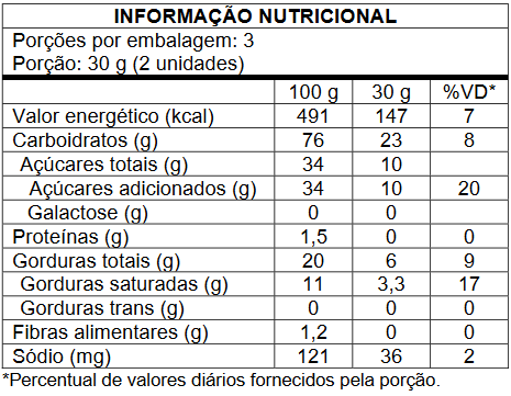Ingredientes: amido, açúcar, gotas sabor chocolate, gordura vegetal, farinha de arroz, sal rosa do Himalaia, emulsificante lecitina de girassol, aromatizantes, fermentos químicos: bicarbonato de amônio e bicarbonato de sódio, espessante goma xantana e regulador de acidez ácido cítrico.