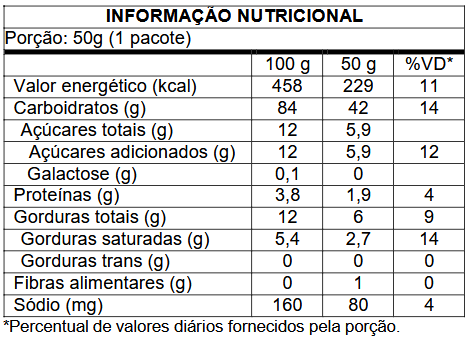 Ingredientes: farinha de arroz, fécula de batata, isomaltoligossacarídeo de mandioca, açúcar, suco de maçã, óleo de palma, banana em pó liofilizada, amido modificado de batata, sal rosa do Himalaia, emulsificante lecitina de girassol, aromatizantes, fermentos químicos: bicarbonato de sódio e Bicarbonato de amônio, espessante goma xantana e acidulante ácido cítrico.