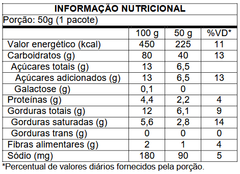 Ingredientes: farinha de arroz, fécula de batata, isomaltoligossacarídeo de mandioca, açúcar, suco de maçã, óleo de palma, cacau em pó, amido modificado de batata, beterraba em pó, sal rosa do Himalaia, emulsificante lecitina de girassol, aromatizantes, fermentos químicos: bicarbonato de sódio e Bicarbonato de amônio, espessante goma xantana e acidulante ácido cítrico.
